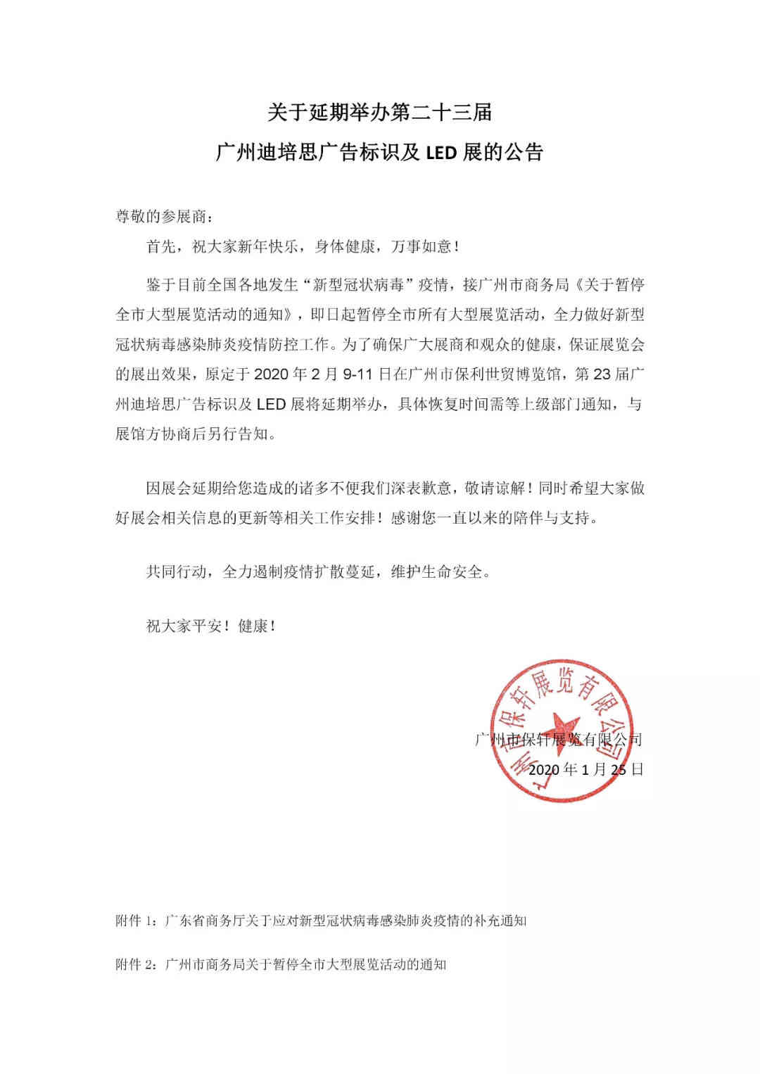 針對目前“新型冠狀病毒”的疫情防控要求,接廣州市商務局《關于暫停全市大型展覽活動的通知》,即日起暫停全市所有大型展覽活動,全力做好新型冠狀病毒感染肺炎疫情防控工作。為保障廣大展商和觀眾的健康,保證展覽會的展出效果,原定于2020年2月9-11日在廣州市保利世貿博覽館舉辦的“第23屆迪培思廣州國際廣告標識及LED展”將延期舉辦,具體恢復時間將根據形">