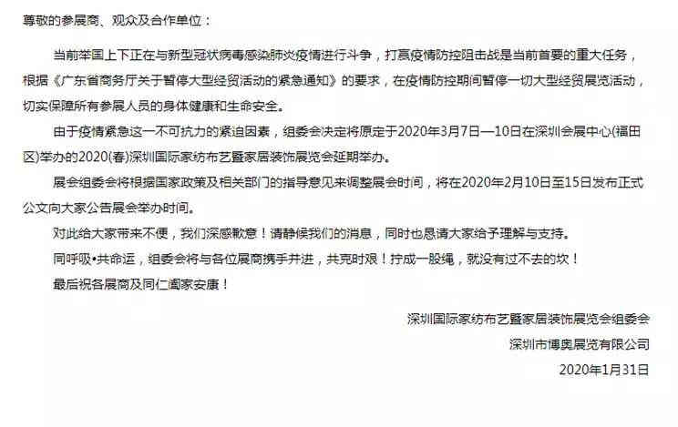 2020(春)深圳國際家紡布藝暨家居裝飾展覽會原計劃于3月7-10日在深圳會展中心舉辦,現已發布延遲通知,并將在2月10-15日發布公文公告具體舉辦時間。