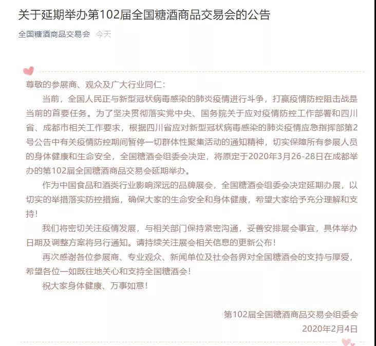 第102屆春季全國糖酒商品交易會原定于3月26-28日在成都舉辦,現已確定日期延后,具體時間另行通知。