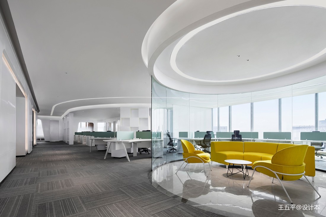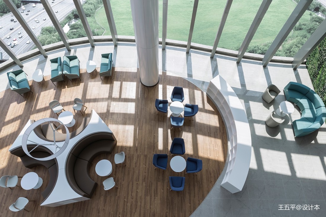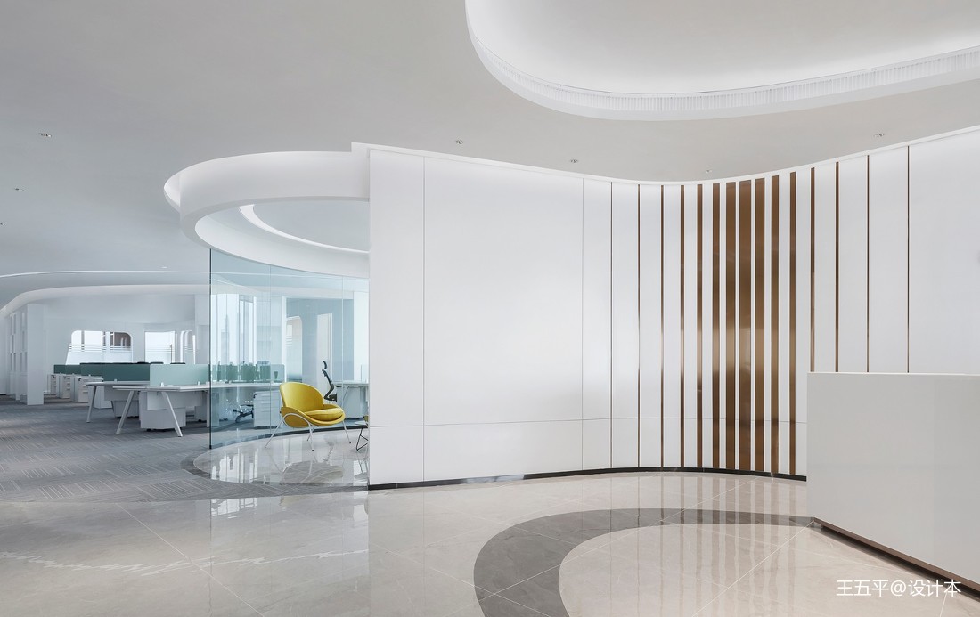 俯瞰空間,光陰交織,線面糅合。曲線元素打破呆板和無趣,賦予空間多變性?;《缺尘熬徑饪臻g突兀感,將空間柔化,并貫穿空間每一個角落。簡單而充滿未來感的燈具,在低調(diào)中,卻成為另一亮點,迸發(fā)著設計師的創(chuàng)意與靈感。開放式的空間,辦公、洽談或是端詳風景,洋溢著的高端與時尚,溢于言表。