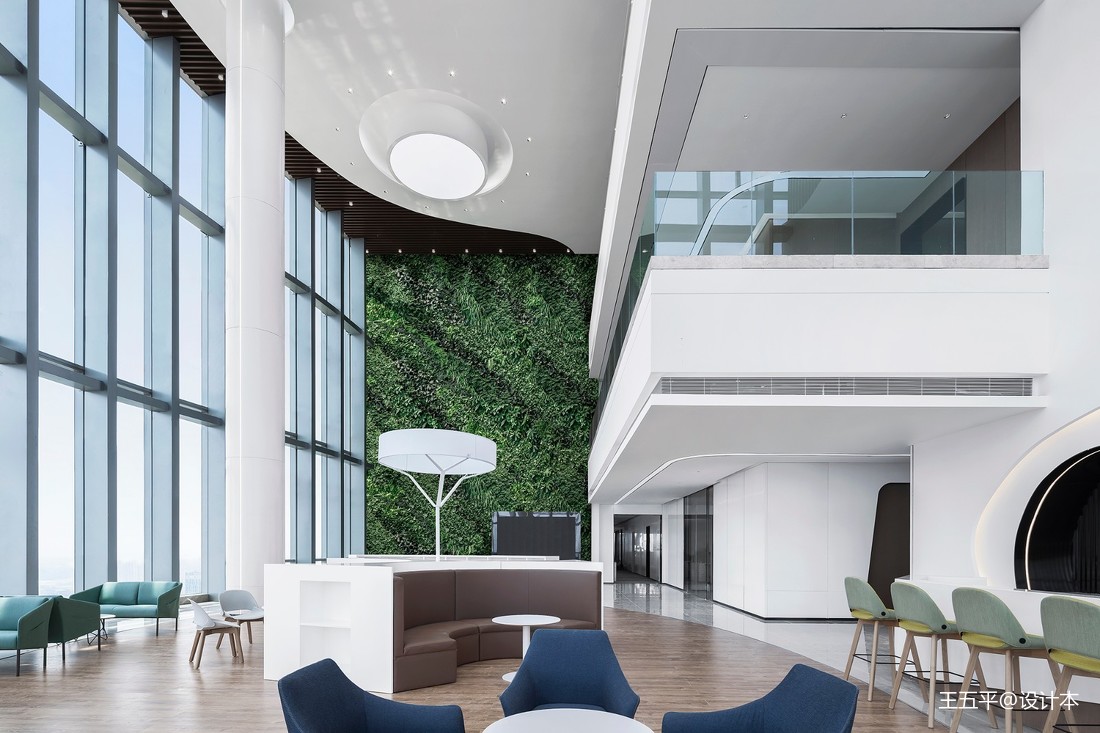 本項目盤踞于南寧市五象新區(qū),恢弘大氣。室內(nèi)辦公大堂則延續(xù)了建筑風格,糅合了科技與藝術的理念,以創(chuàng)新的手法抒寫現(xiàn)代化辦公國際風貌。中空大堂的室內(nèi)有三層之高,四周柱子撐起了豪邁的空間風骨,設計以白色為主色,搭配以綠、藍、褐,藉由造型和色彩的純粹性,帶來無與倫比的審美享受。
